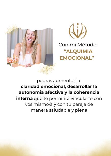Soy psicóloga especializada en terapia de pareja y coach ontológica, creadora de la filosofía Alquimia Emocional, un camino para transformar el dolor en bienestar y los vínculos en espacios de crecimiento, plenitud y amor consciente.